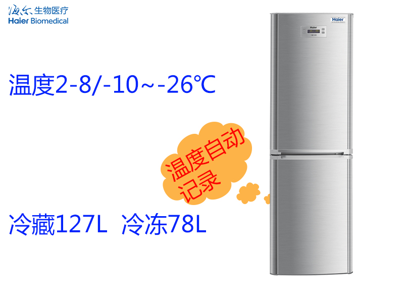 海爾藏冷凍保存箱HYCD-205,冷藏2~8℃ ,冷凍-10~-26℃;冷藏127L冷凍78L;冷藏室超大容量;冷凍室雙密封,保溫好; 內(nèi)膽全不銹鋼;冷藏冷凍雙顯,冷藏室、冷凍室溫度顯示,一目了然;溫度自動(dòng)記錄,自動(dòng)存儲(chǔ),帶U盤即插即用;高低溫、傳感器故障、斷電等多重自動(dòng)聲光報(bào)警